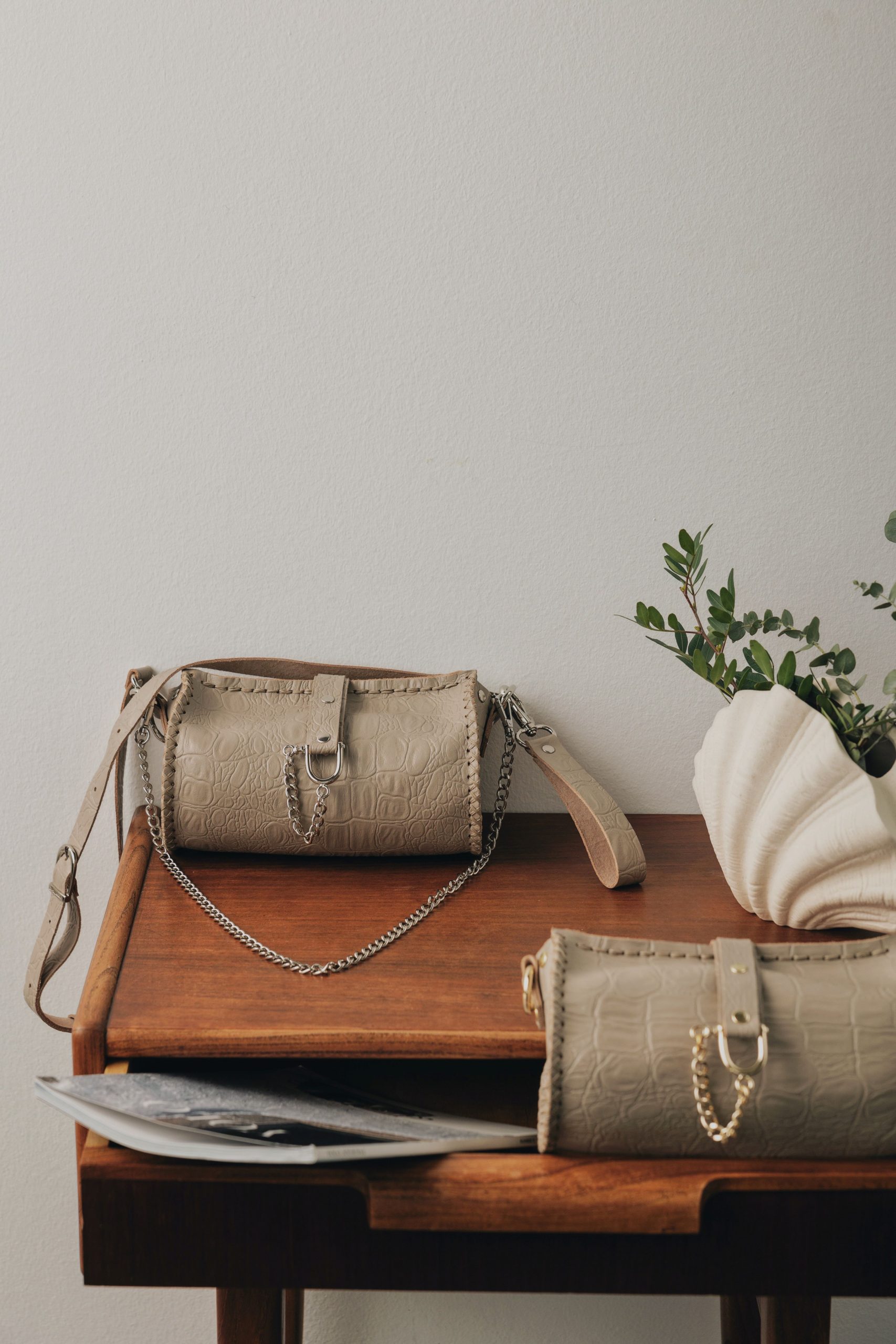 High on emotion stone beige nickel bag INDIVIDUAL ART LEATHER: Χειροποίητη δερμάτινη τσάντα σε μπεζ χρώμα με μεταλλικές λεπτομέρειες από την INDIVIDUAL ART LEATHER.