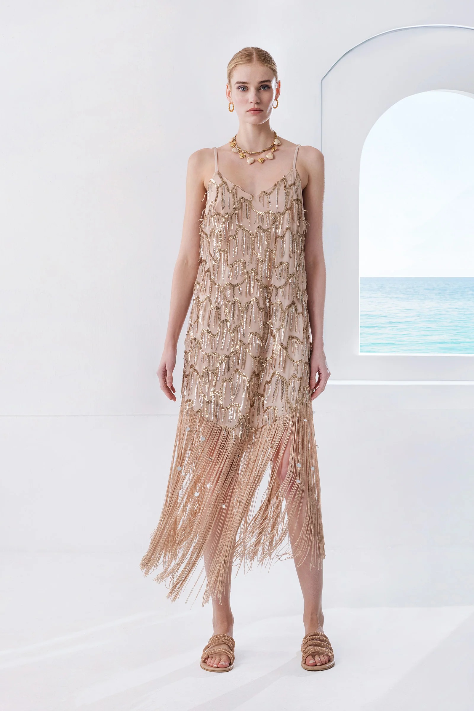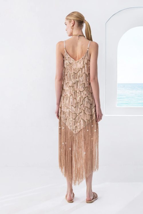 Rayne dress MYA COLLECTION: Φόρεμα midi με κρόσια και παγιέτα σε μπεζ χρώμα από την MYA COLLECTION.