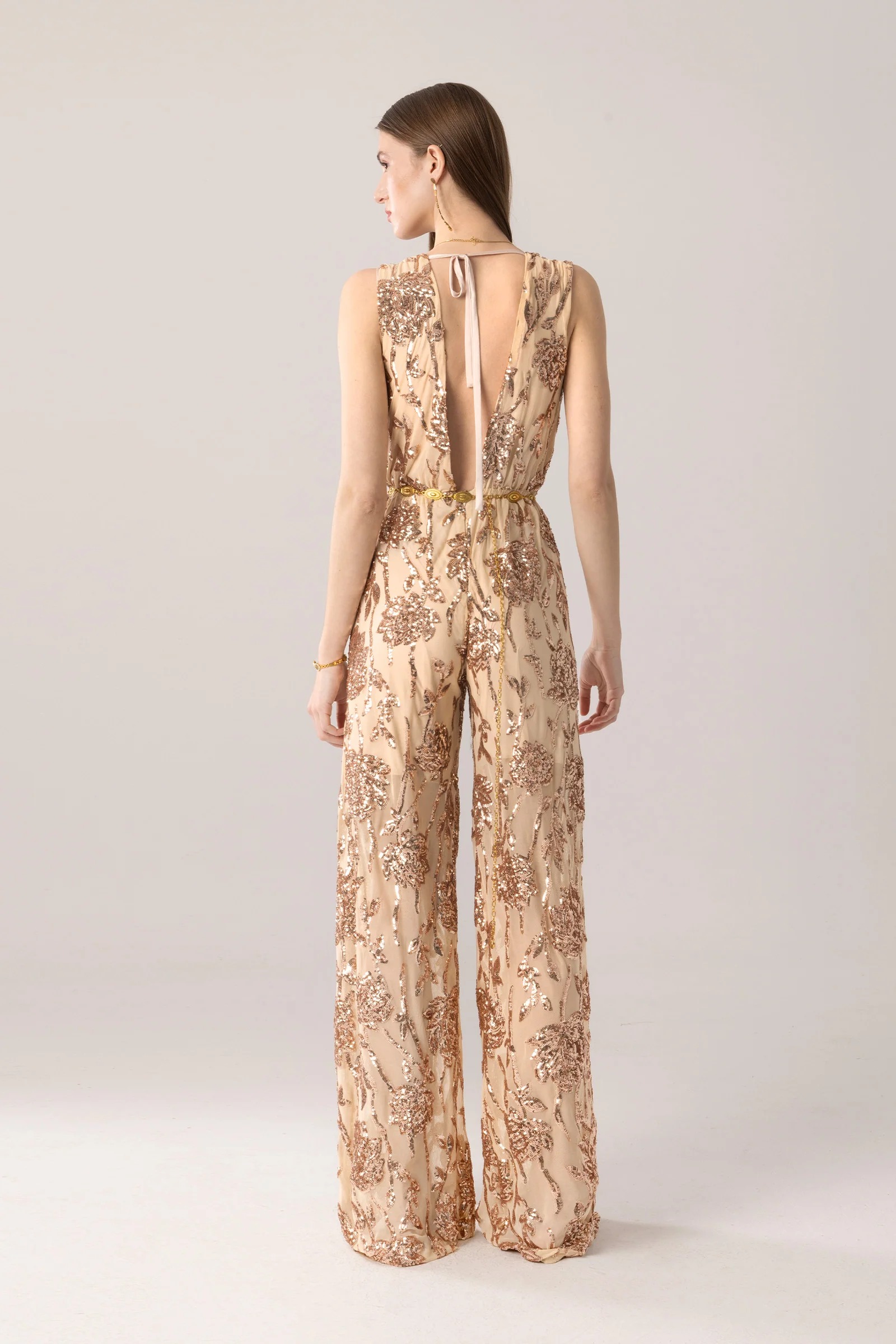 Zaria jumpsuit MYA COLLECTION: Ολόσωμη φόρμα παγιέτα με άνοιγμα στη πλάτη σε μπεζ χρώμα από την MYA COLLECTION.
